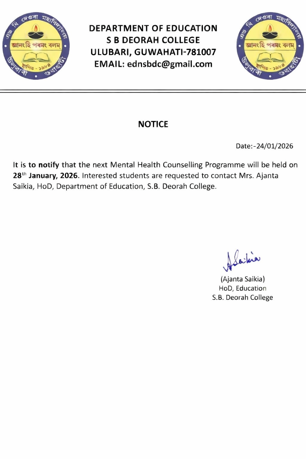 | 1007 | স্নাতক মহলাৰ মানসিক স্বাস্থ্য আৰু স্বাস্থ্যবিজ্ঞান | বৰকাকতি, বৰা | EDU-2643 |